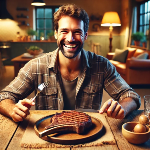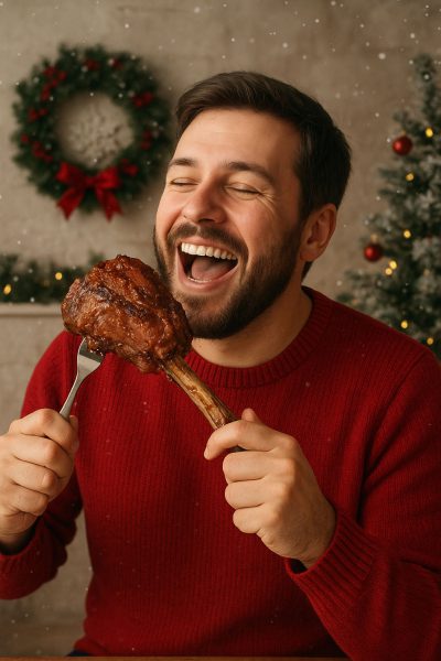 I had AI create an image of a man eating meat to use on a post-Christmas party invitation. I also did this last year. For your enjoyment, here are the two images.